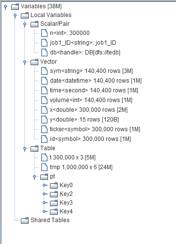 The total size of all the DolphinDB variables in memory is displayed within the square brackets to the right of Variables on the top of the Variable Explorer.