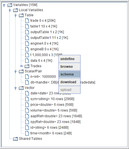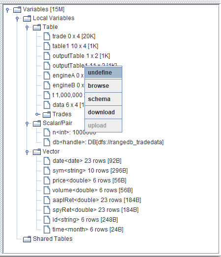 To save a variable locally (or upload a file to DolphinDB server), you can right click a variable in the explorer and select download or upload.