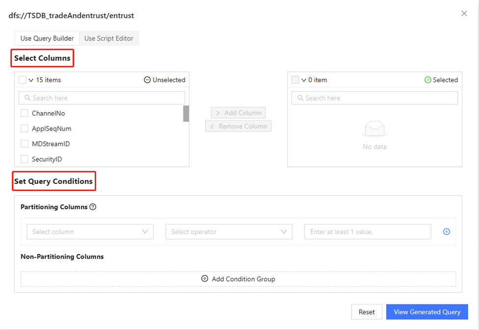 After column selection and condition setting, users can click View Generated Query to dynamically generate corresponding SQL scripts. To set the settings, users can click Reset.