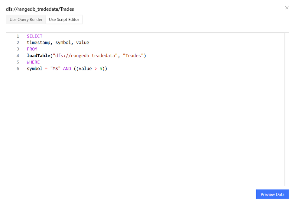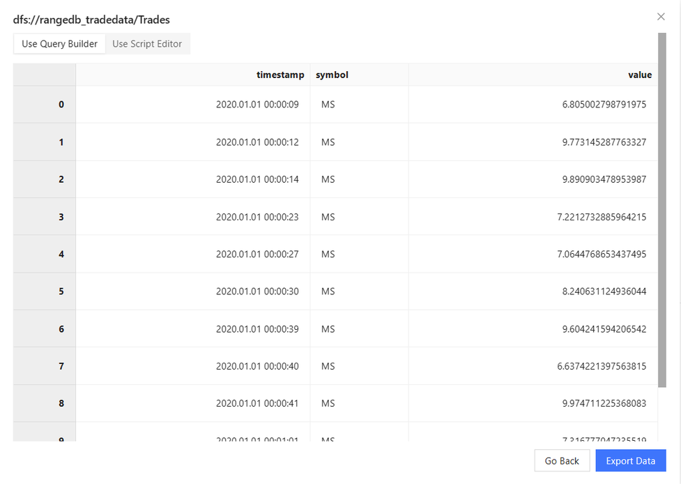 In the DolphinDB web interface, users can query a table in two ways: Query Builder and Script Editor. After the query, users can preview and directly export the query result in CSV format.
