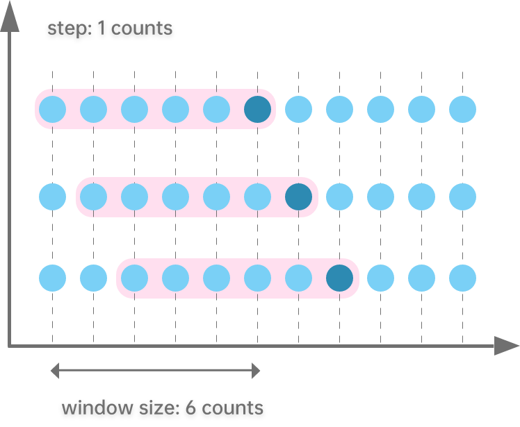 DolphinDB provides moving functions (m-functions) for sliding window aggregation. A window of a specified size slides over each element in the given data set to perform a calculation on the windowed values. The result has the same size as the given data.