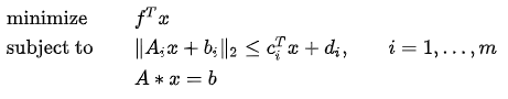 Solve SOCP problems and calculate the minimum of the objective function under specified constraints. The standard form of the SOCP constraint is as follows: