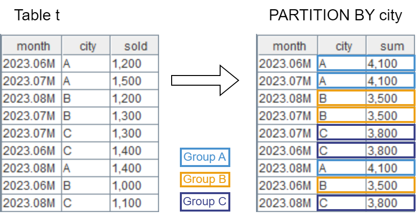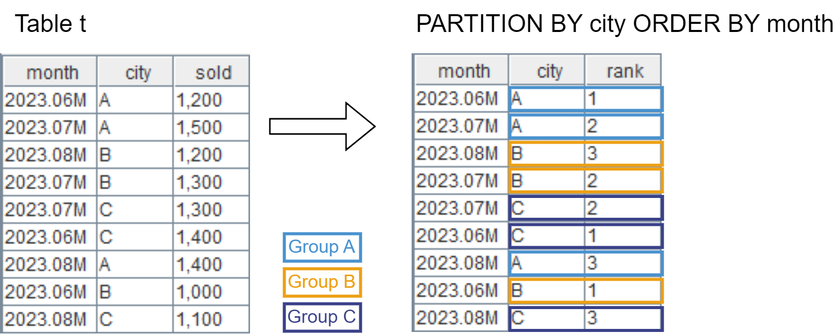 rank() OVER (PARTITION BY city ORDER BY month) AS rank