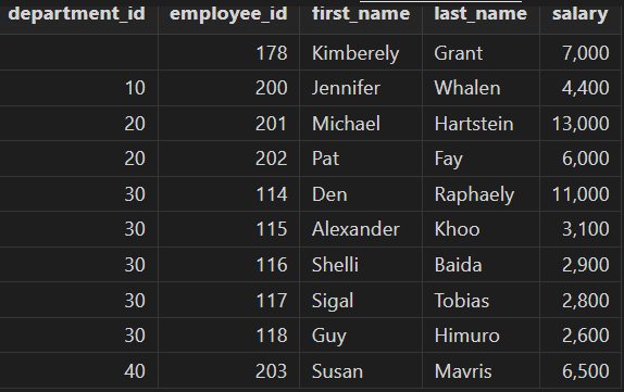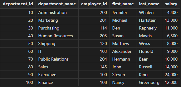 The following example queries information on employee salaries by department in Oracle mode, including department information, the number of employees, etc: