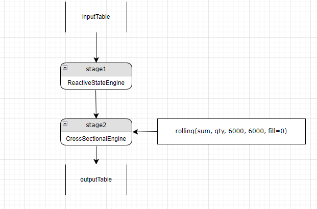 For example, we have a reactive state engine at stage 1 and a cross-sectional engine at stage 2. Further parsing finds a new stage 2 metric, rolling(sum, qty, 6000, 6000, fill=0), which needs a time-series engine. A new time-series engine (now stage 2) is added before the cross-sectional stage (now stage 3). Stage 3 gets a column reference to accept the result from the added time-series engine stage.