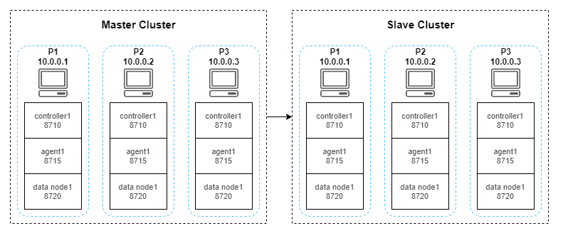 clusterReplicationMasterCtl=10.0.0.1:8848If the master cluster is a high-availability cluster, any controller in the raft group can be specified. This example uses the controller of server P1.