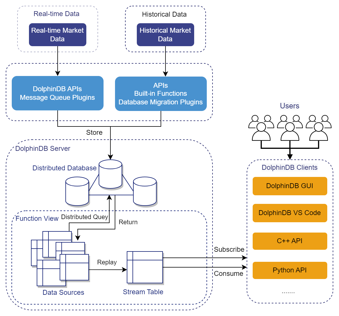 - Market Data Ingestion: Both real-time and historical tick data can be imported to the DolphinDB distributed database via the DolphinDB API or a plugin.