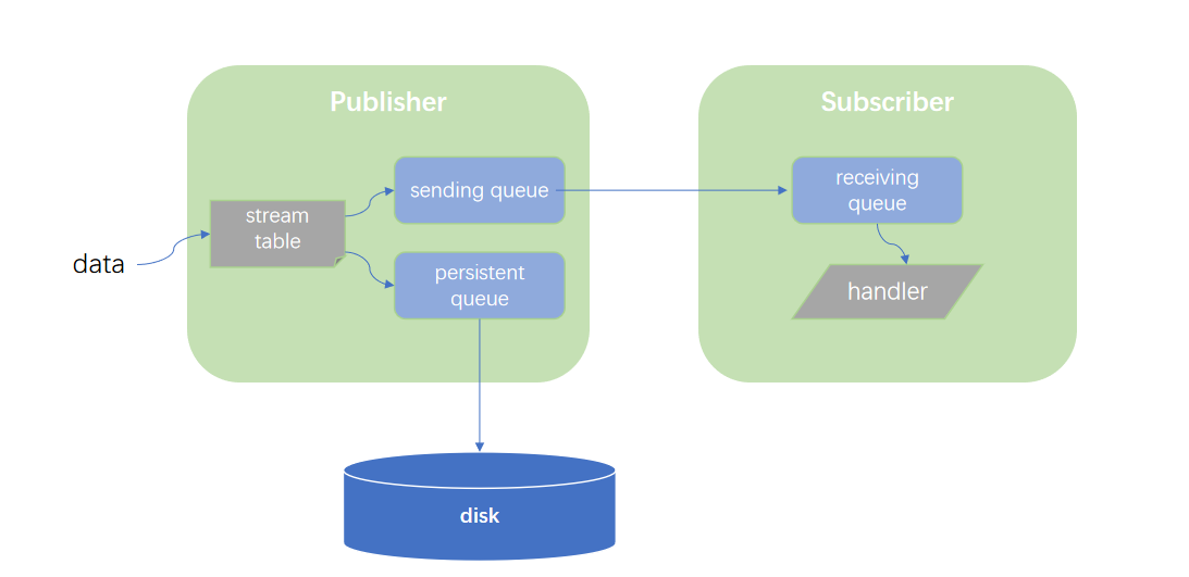 As the streaming data enter the stream processing system, they are first appended to the stream table on the publisher side, then to the persistent queue and the sending queue. Assuming the asynchronous persistence is enabled, data in the persistent queue will be written to disk asynchronously; data in the sending queue will be sent to the receiving queue on the subscriber nodes, awaiting the specified handler to fetch it for further processing. The figure below illustrates the entire process: