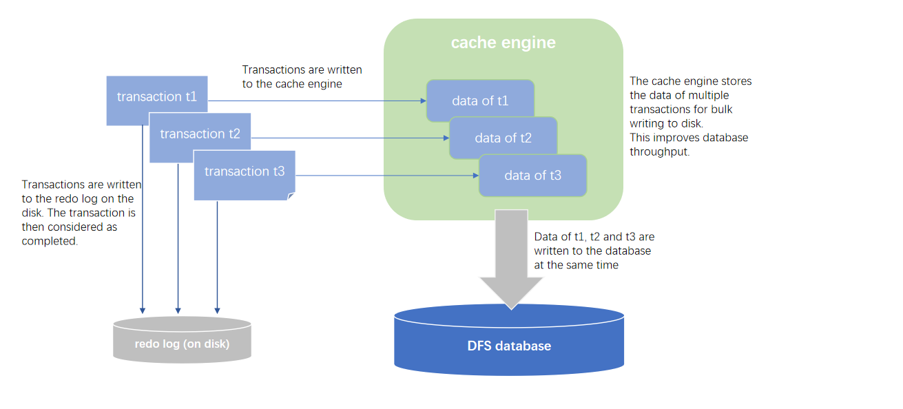 By default, redo log is disabled in the OLAP storage engine. Data is written to disk directly instead of going through the cache engine. Specify the capacity of the OLAP cache engine with configuration parameter chunkCacheEngineMemSize and enable redo log by specifying dataSync=1. The following figure shows how data are written to the database through the redo log and the cache engine. The transactions are first written to the redo log and the cache engine. In the cache engine, once the conditions for writing cached data to the database are met, the data of the three transactions will be written to the DFS database at the same time.