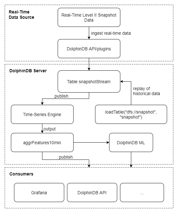 - Ingest real-time stream data into table snapshotStream via DolphinDB API;