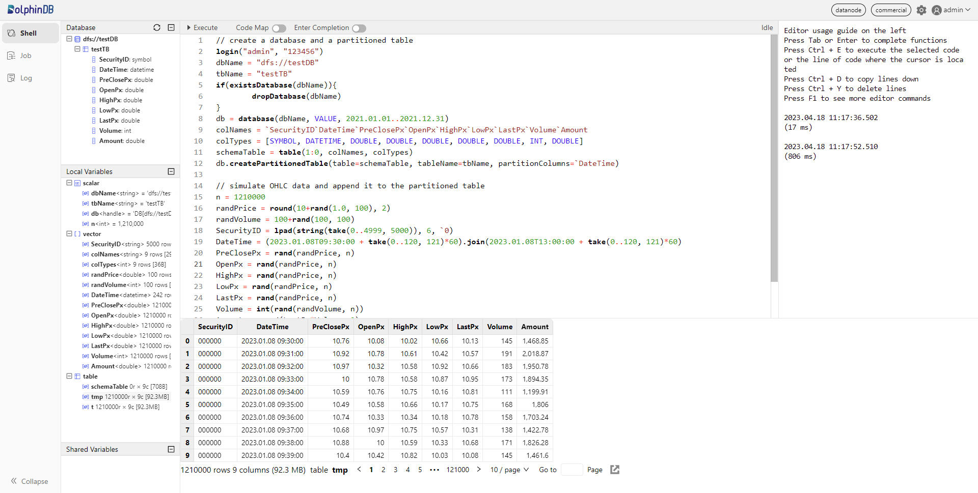 Then, run the following scripts to generate 1-minute OHLC bars and append the data to the created partitioned table "tbName":