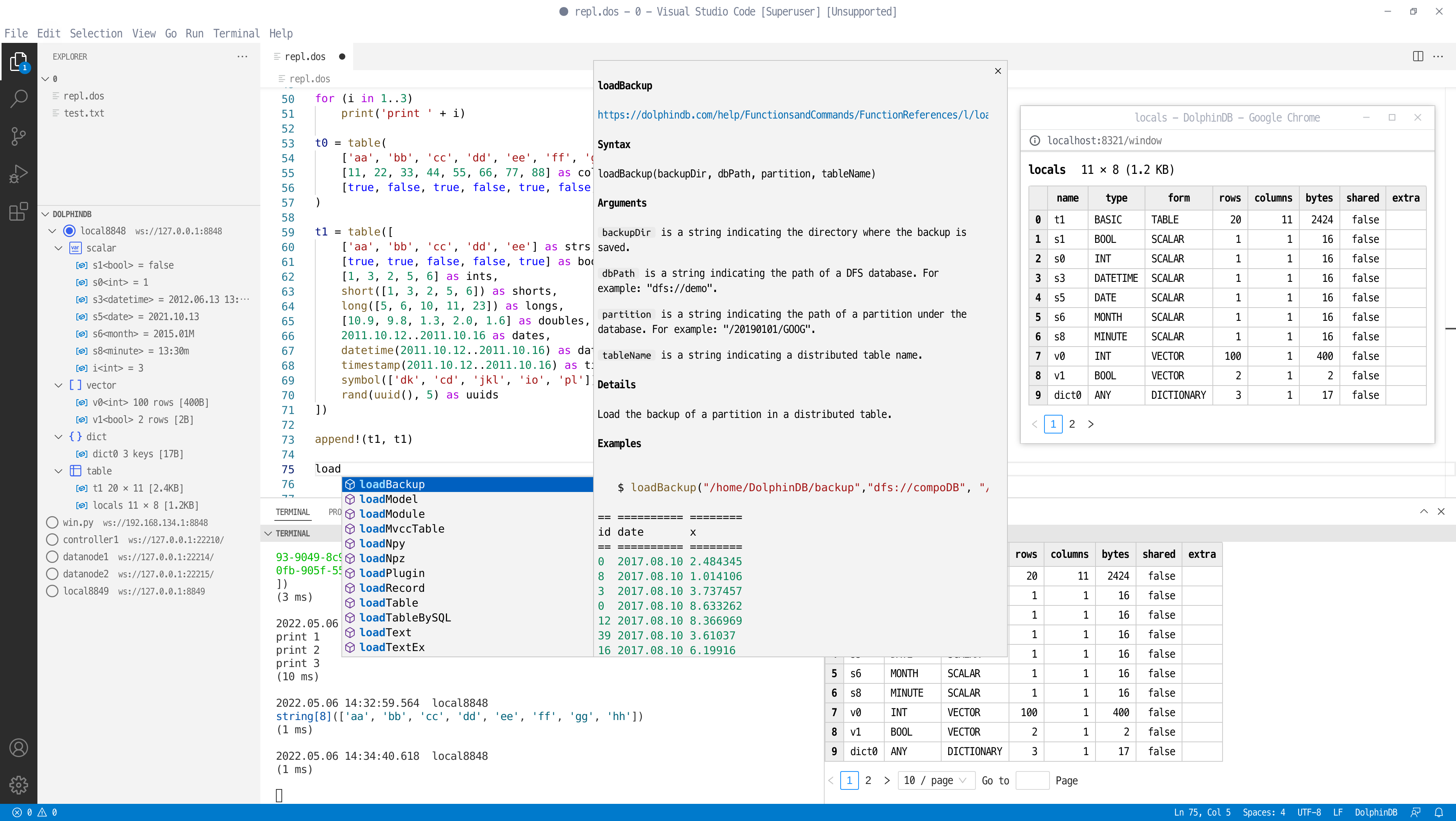.dos(short for DolphinDB Script), the extension will automatically recognize the DolphinDB language and enable syntax highlighting, code completion and prompts. - If the script file is not a