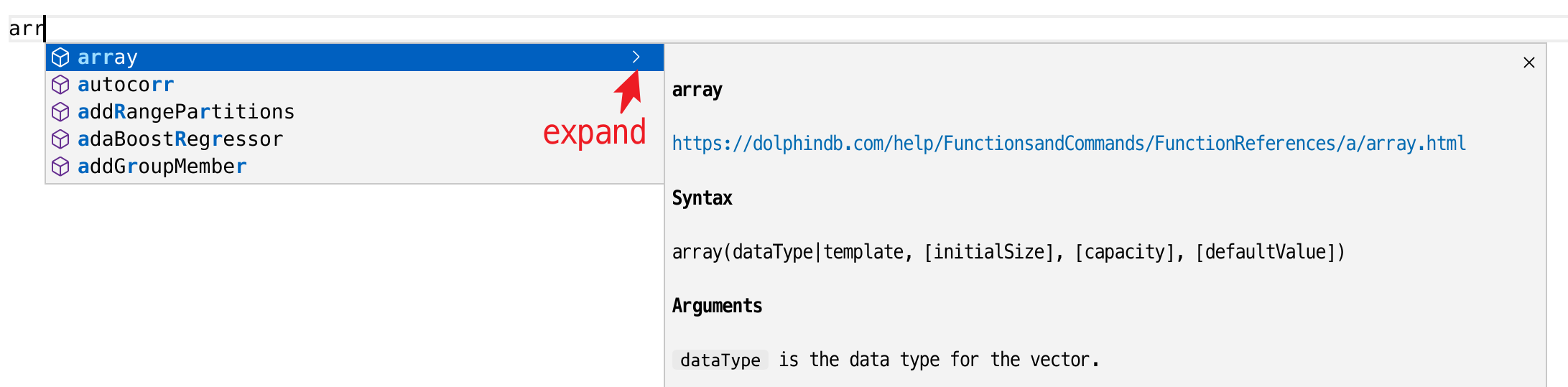 When entering a DolphinDB built-in function in the VS Code editor, suggestions and the documentation for the function will pop up as you type. Click the arrow icon ("Read More") next to the function prompt to dispaly/hide the documentation.
