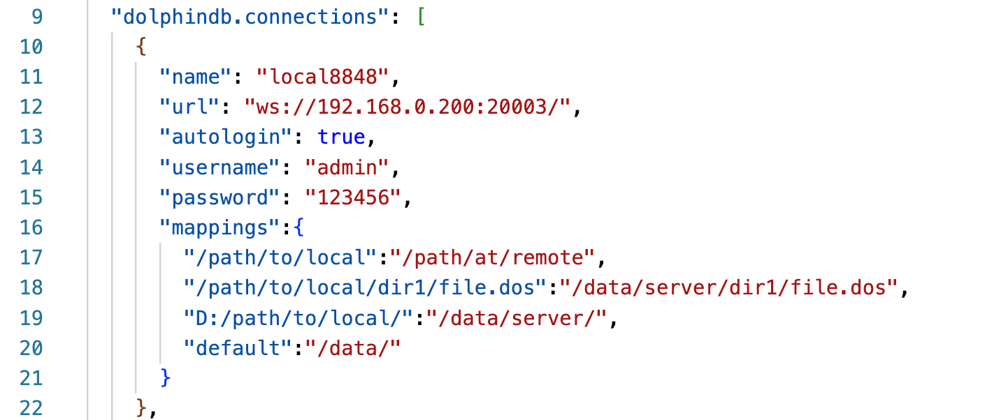 In the VS Code settings, select DolphinDB under extension, open the setting.json file, add or modify mappings in the connection that needs to be configured, the "key" on the left is the local address, and the "value" on the right is the server address.