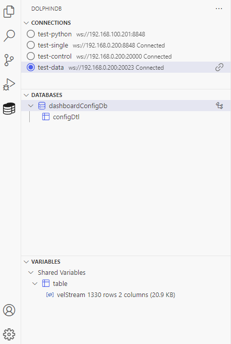 After installing the DolphinDB extension, an icon will be added to the Activity Bar in the VS Code. Click the icon, the DolphinDB sidebar will be displayed with three views including CONNECTIONS, DATABASES, and VARIABLES.