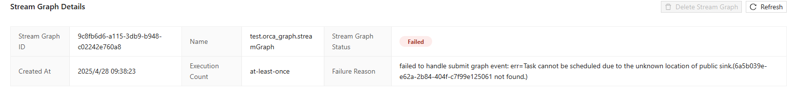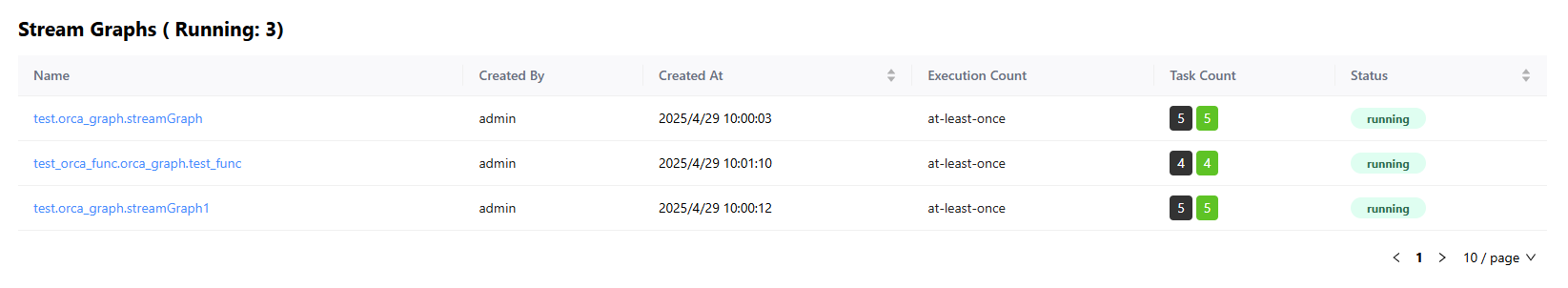 Through the Stream Graph module, users can monitor stream graphs created via Orca in real time, including the task count, execution count and the current status. Users can click any stream graph name to view its details page.