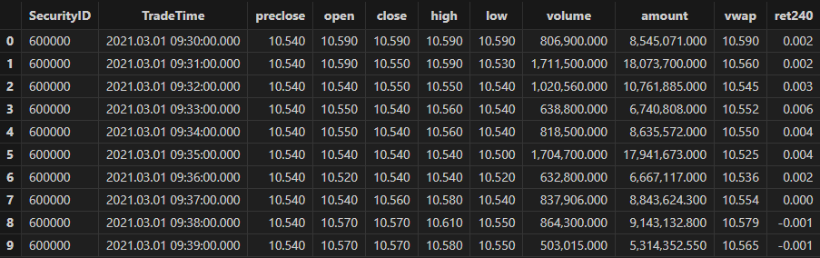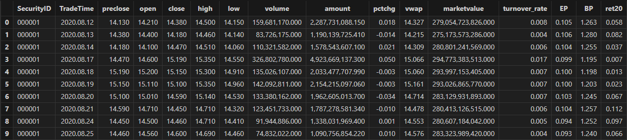 colNames = ["SecurityID","TradeDate","ret20","preclose","open","close","high","low","volume","amount","vwap","marketvalue","turnover_rate","pctchg","PE","PB"]