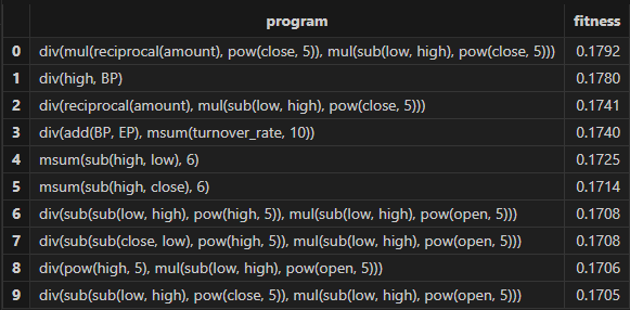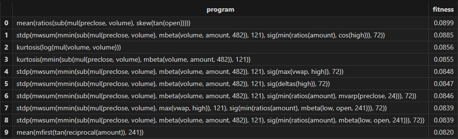 The expression and fitness result table returned by Shark GPLearn is as follows. As shown, Shark GPLearn has perfectly fitted the target function: