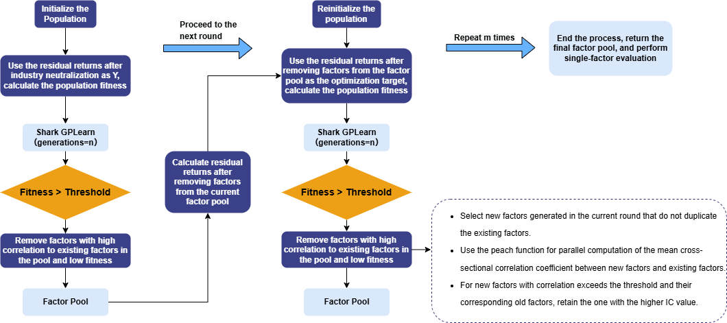 GPLearnEngine is primarily responsible for scheduling tasks during training, including population generation, evolution, and mutation operations. During initialization, GPLearnEngine generates an initial population of formulas and uses a predefined objective function to evaluate how well these formulas align with the given data. Different fitness functions can be used for different applications: for example, in regression problems, the mean squared error between the target value and the formula result can be used, while for quantization factors generated by the genetic algorithm, factor IC can be used as the fitness function.