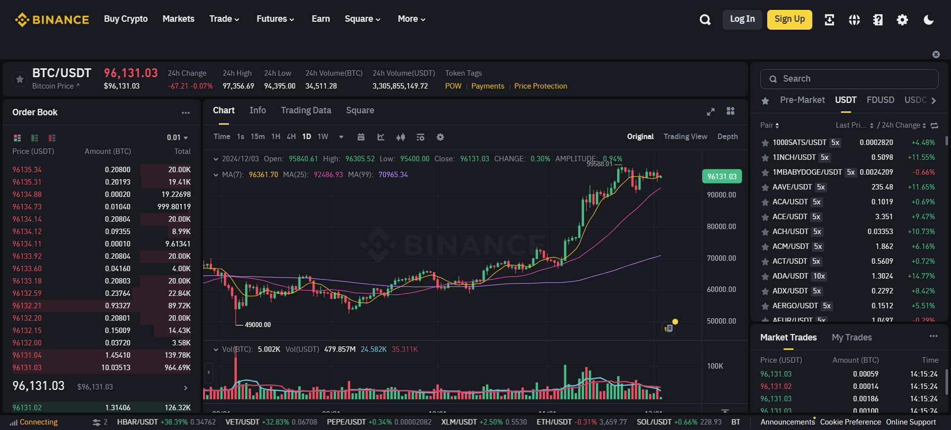 BTC/USDT is a trading pair that represents the price relationship between Bitcoin (BTC) and Tether (USDT), which is commonly regarded as a benchmark for Bitcoin’s price. For example, as shown in the figure below (captured from Binance in December 2024), the BTC/USDT price is 96,191.03, meaning it costs 96,191.03 USDT to purchase 1 BTC.