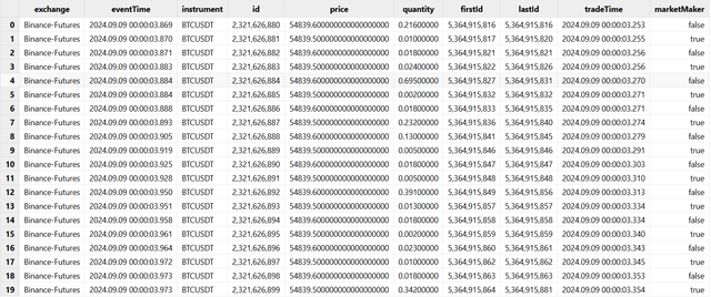 This tutorial uses Binance’s market snapshot data, specifically the aggregated trade data and the 500-level order book data for USDT-margined contracts. In addition, perpetual contracts require funding rate details to calculate the strategy’s return. This section primarily introduces the data required for strategy backtesting and explains how to obtain funding rate data.