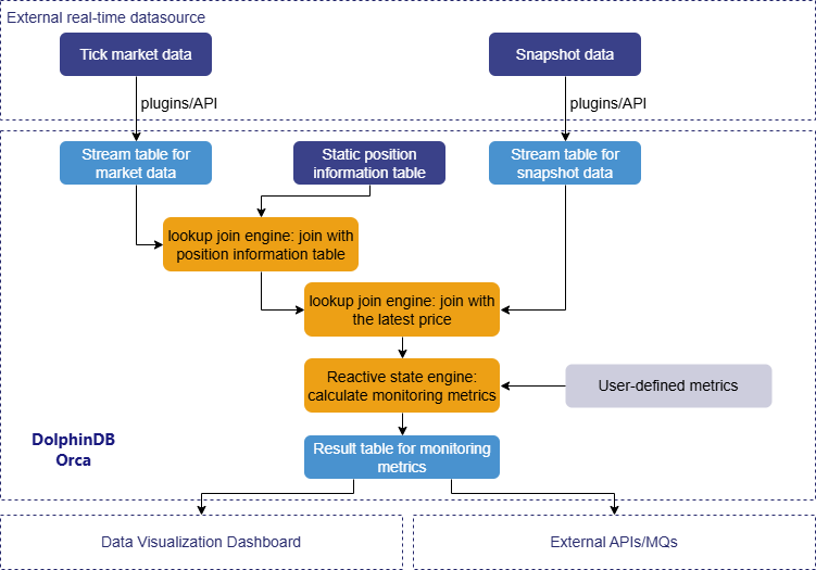 - Stage 1-Data preprocessing: Using streaming join engines to join the market data table with the position information and snapshot data tables. This generates a comprehensive wide table, which will be used for subsequent business metric calculations.