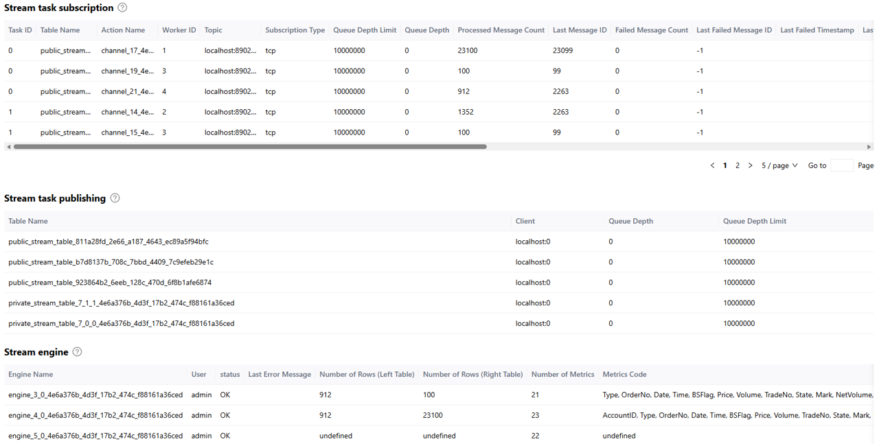 By referring to the tables below, such as Stream task subscription, Stream task publishing, and Stream engine, you can monitor the real-time status of the workers on subscribers, connection status between the local publisher and its subscribers, as well as the status of engines and tables, as shown in the figure below: