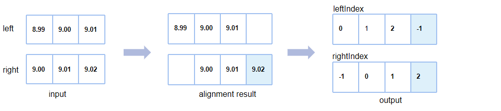 $ leftIndex, rightIndex = rowAlign(left, right, "bid")