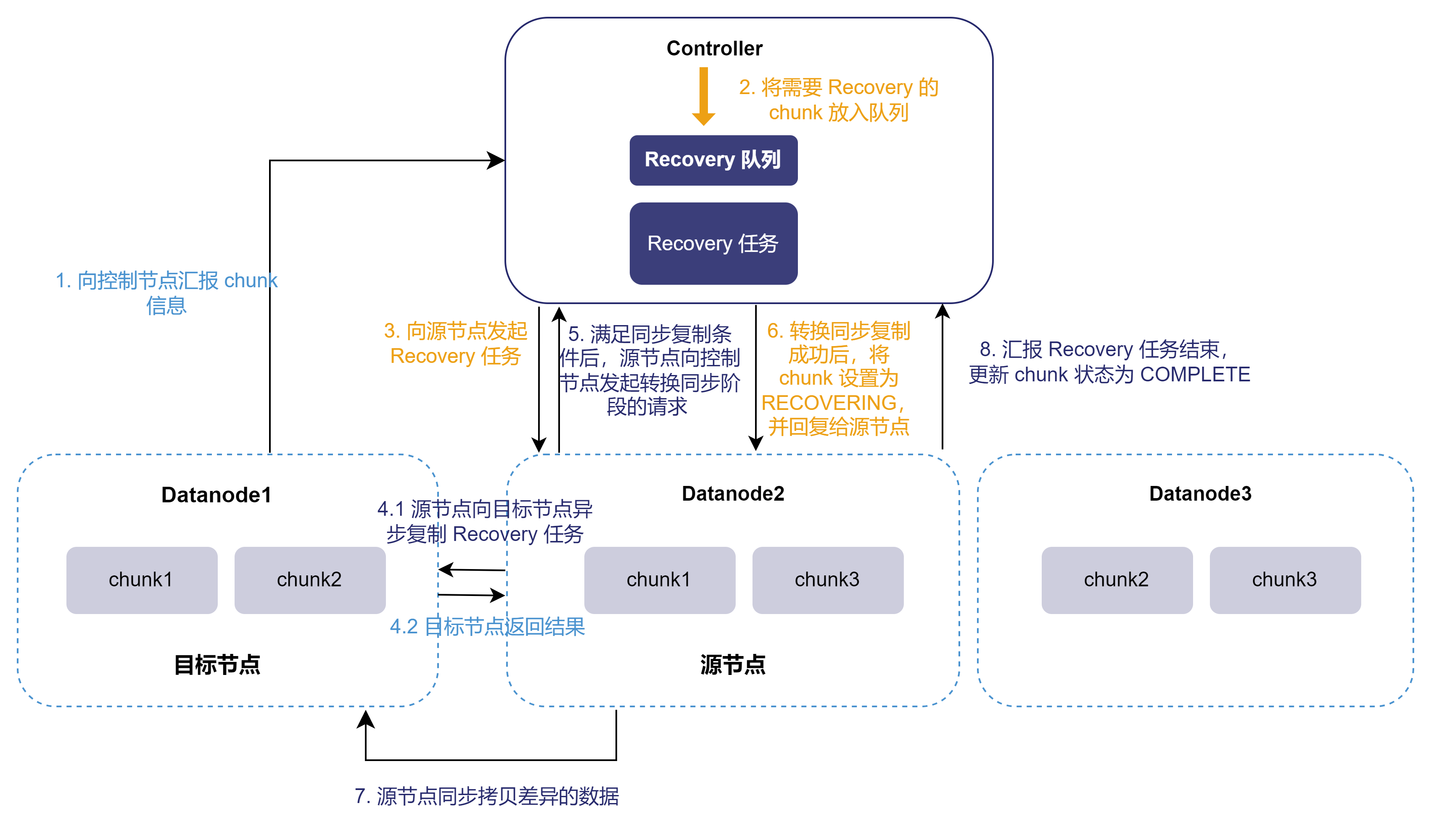 以包含一个控制节点和三个数据节点的集群为例。该集群副本数为2,Datanode1 从故障中恢复。通过图示展示在线恢复的过程: