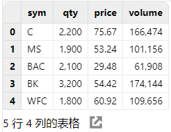 t = table(sym, qty, price)