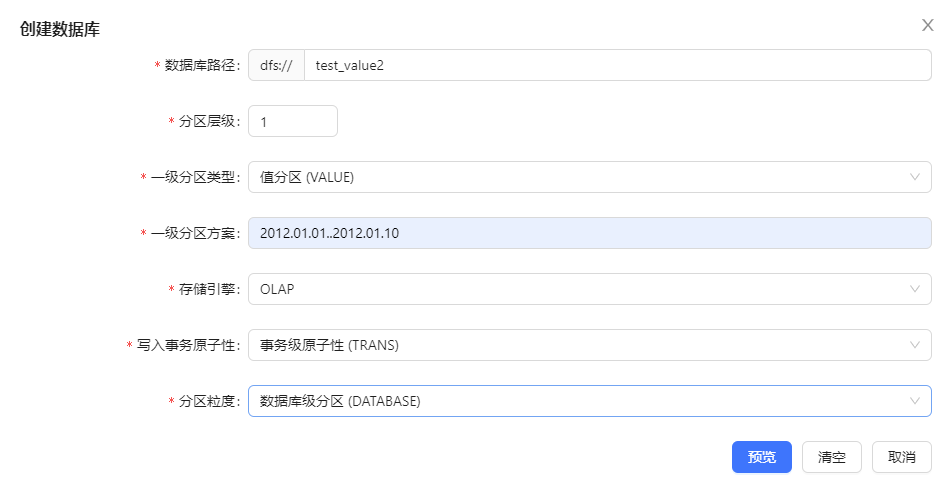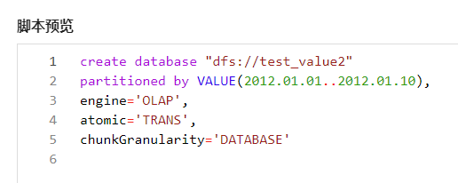 点击“取消”,取消建库操作;点击“清空”,清空上图中所填写内容;点击“预览”,进入脚本预览窗口,可以看到具体的建库语句,如下图:
