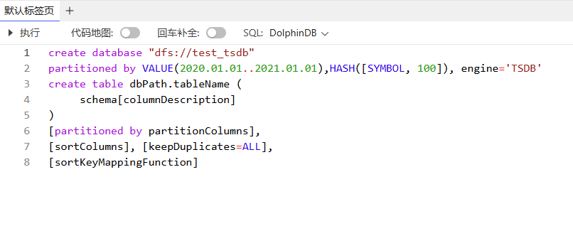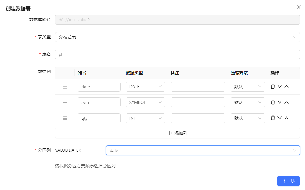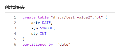 例子:在编辑器中输入并执行以下代码,创建分布式表 pt。