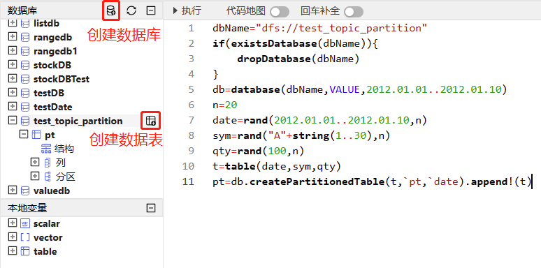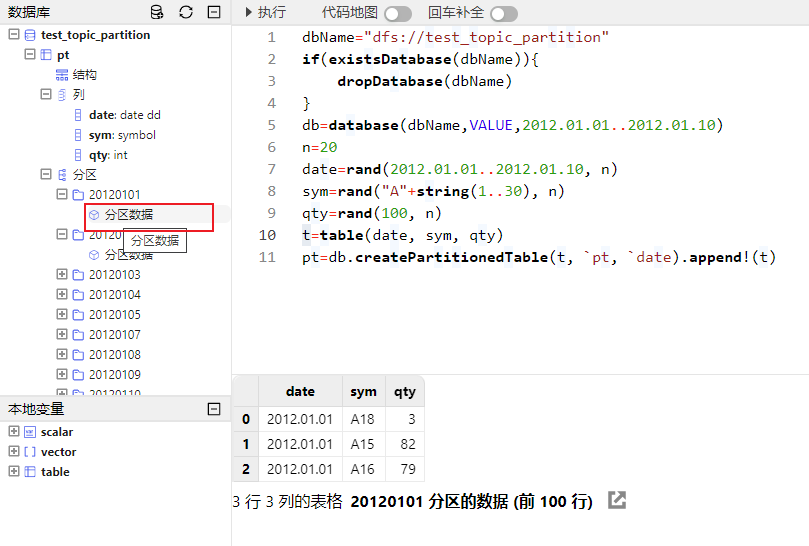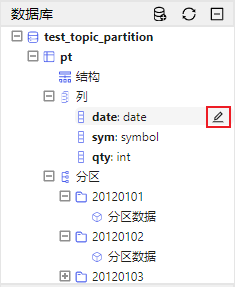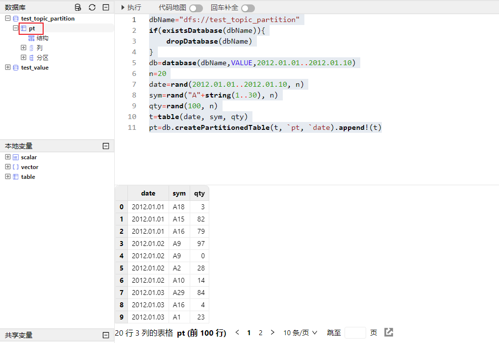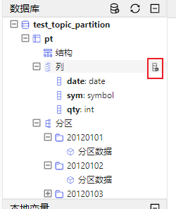 dbName="dfs://test_topic_partition" if(existsDatabase(dbName)){ dropDatabase(dbName) } db=database(dbName,VALUE,2012.01.01..2012.01.10) n=20 date=rand(2012.01.01..2012.01.10, n) sym=rand("A"+string(1..30), n) qty=rand(100, n) t=table(date, sym, qty) pt=db.createPartitionedTable(t, `pt, `date).append!(t)如下图所示,在数据库浏览器中,分层展示了各数据库及其所属表。点击变量前的 ➕,可以展示数据表的结构、所包含的列,每列的名称及类型、分区。点击变量前的 ➖,折叠展示的内容。