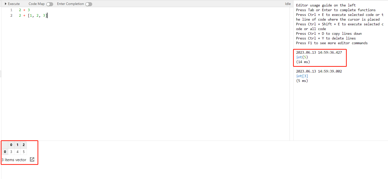 例如,我们在编辑器中运行 2 + 3,结果将显示在日志浏览器中。在编辑器中运行 2 + [1, 2, 3],结果将显示在数据浏览器中。见下图:
