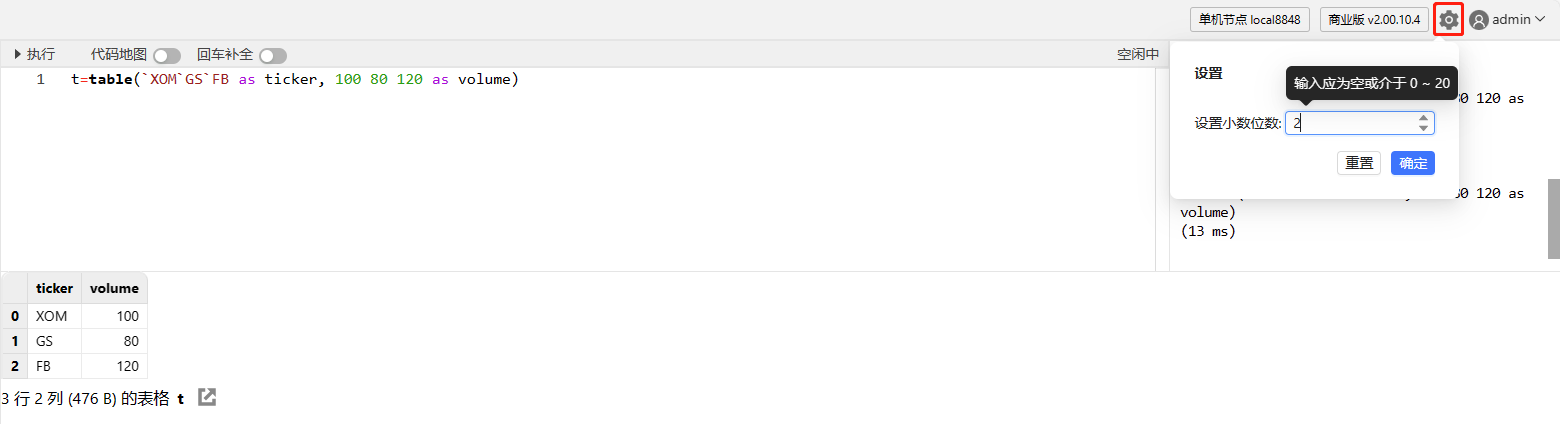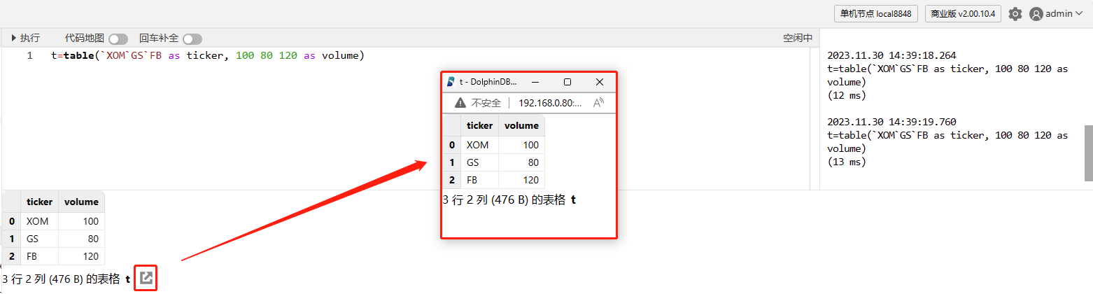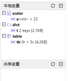 通过点击变量浏览器的向量/矩阵/内存表,可在数据浏览器查看其数据。分布式表的数据请通过数据库浏览器查看。