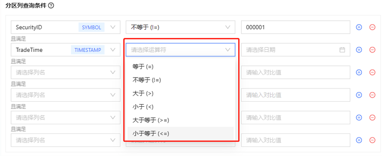 下拉框中将显示当前类型的分区条件列所支持的所有运算符。如图 10 所示,单击下拉框,选择条件运算符。