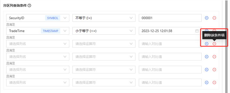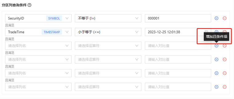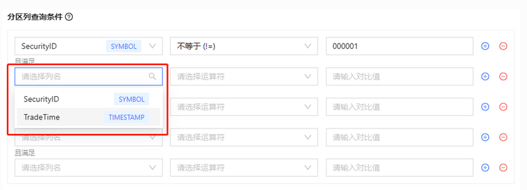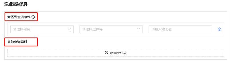 此处可填写当前表支持查询的列中除分区列以外的所有列构成的查询条件。查询条件间支持“且、“或”的逻辑关系。
