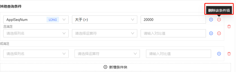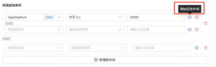 如图 17 所示,用户可单击图标,增加条件项。新增条件项与同条件块中的已增条件项为“且”的逻辑关系。