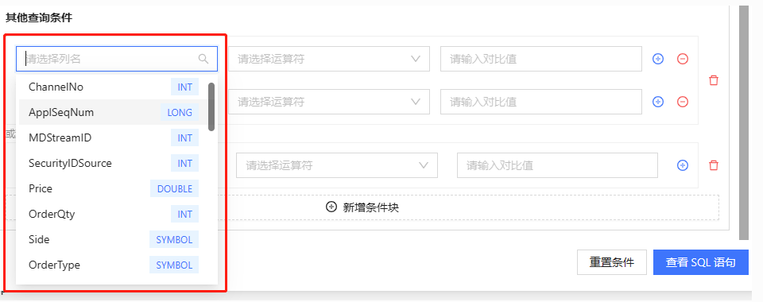 下拉框中将显示当前表支持查询的条件列。如图 19 所示,单击下拉框,选择条件列。