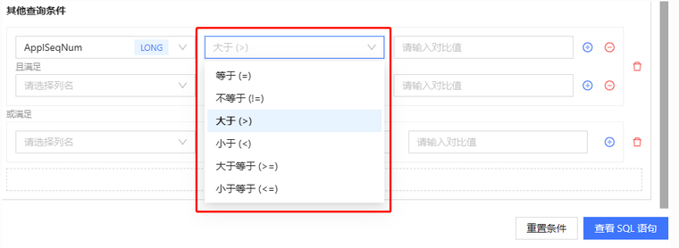 查询条件包含三个必填项——“列名”、“运算符”和“对比值”。用户可设置一个或多个查询条件,条件之间存在“且”、“或”的逻辑关系。