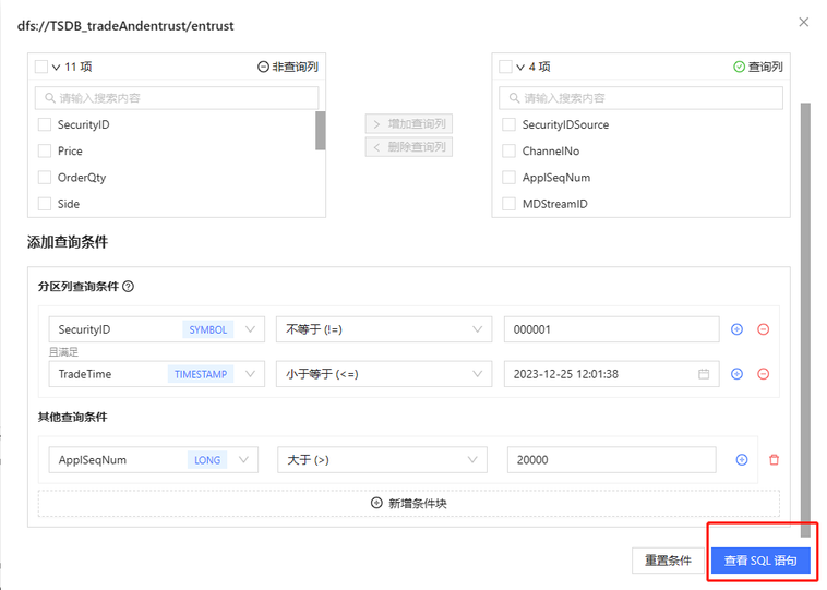 在填写完查询列与查询条件后,即可点击图 21 红框中的“查看 SQL 语句”以查看动态生成的 SQL 语句。