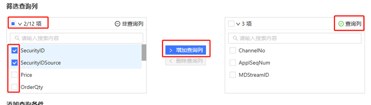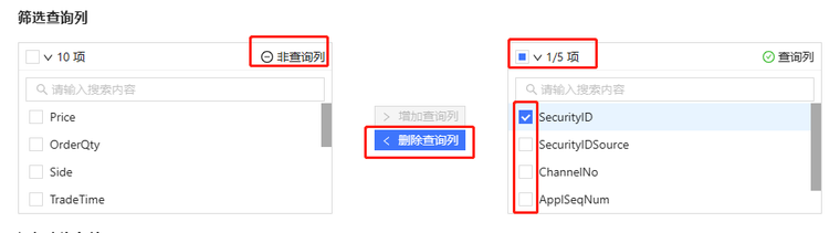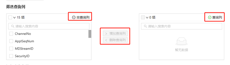 如图 5,左边为非查询列的选择框,用户可在此勾选指定列以增加查询列;右边为查询列的选择框,用户可在此勾选指定列以删除查询列。中间为“增加查询列”和“删除查询列”的动作按钮,其功能如名。