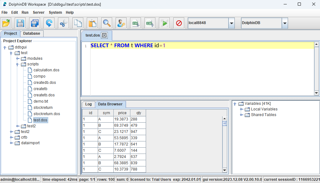 用户能够在 GUI 客户端进行以下操作:查找/替换文本、保留字高亮显示、系统函数提示、行号显示,选择部分代码执行、执行结果浏览、查看 log 信息、临时变量浏览、数据库浏览。通过 Project 浏览器,可以浏览所有项目。通过 Database 浏览器,可以浏览所有 DFS 数据库以及其分区表的 schema。此外,用户能够通过界面中的下拉列表选择已建立的 session,使用 SQL 语言进行脚本编写的用户能够从 SQL 方言兼容性列表中为当前 session 选择 MySQL、Oracle 或 DolphinDB 作为兼容的 SQL 方言。