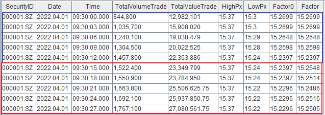对于上述蓝框部分的数据,触发 trueValue 计算逻辑,因此 Factor 的值等于 Factor0 的计算结果;红框部分的数据触发 falseIterFunc 计算逻辑,每条记录的 Factor 是输出表中该记录前三条 Factor 的平均值。