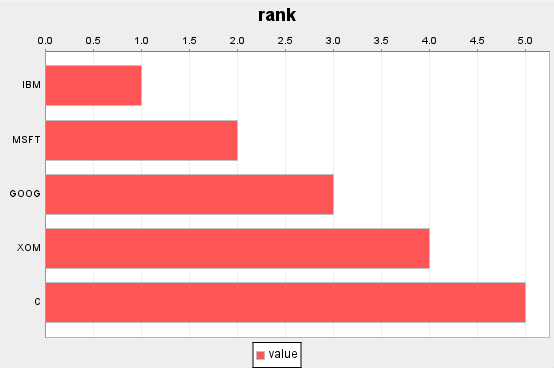 plot(1..5 as value, `IBM`MSFT`GOOG`XOM`C, `rank, BAR)