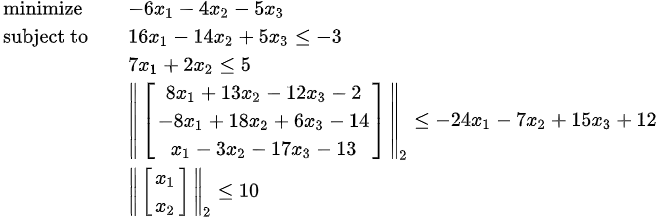 该函数用于求解二阶锥规划问题,计算目标函数在限定条件下的最小值。若其约束条件以标准形式给出,其形式如下: