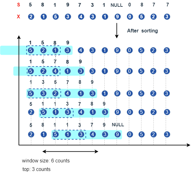 top 是 (1, window] 范围内的一个整数,表示 X 基于 S 排序后的前 top 个元素。