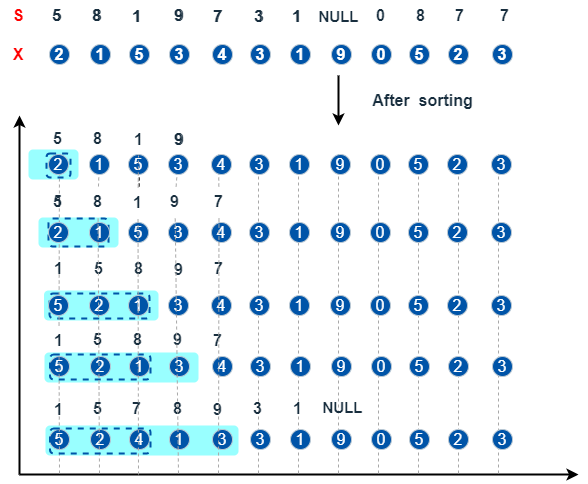 S = [5, 8, 1, 9, 7, 3, 1, NULL, 0, 8, 7, 7]