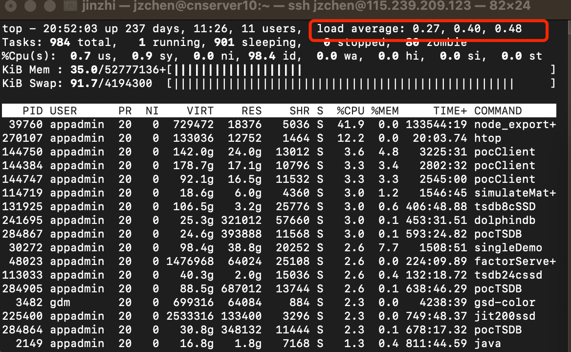 uptime以上两个命令的返回内容里,都有系统1分钟,5分钟,15分钟的平均负载(Load Average)。以 top 为例,返回如下图中红框所示: