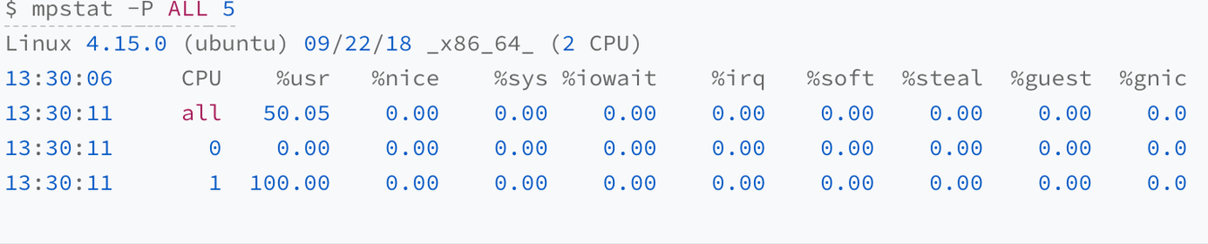 运行 mpstat 查看 CPU 使用率的变化情况:
